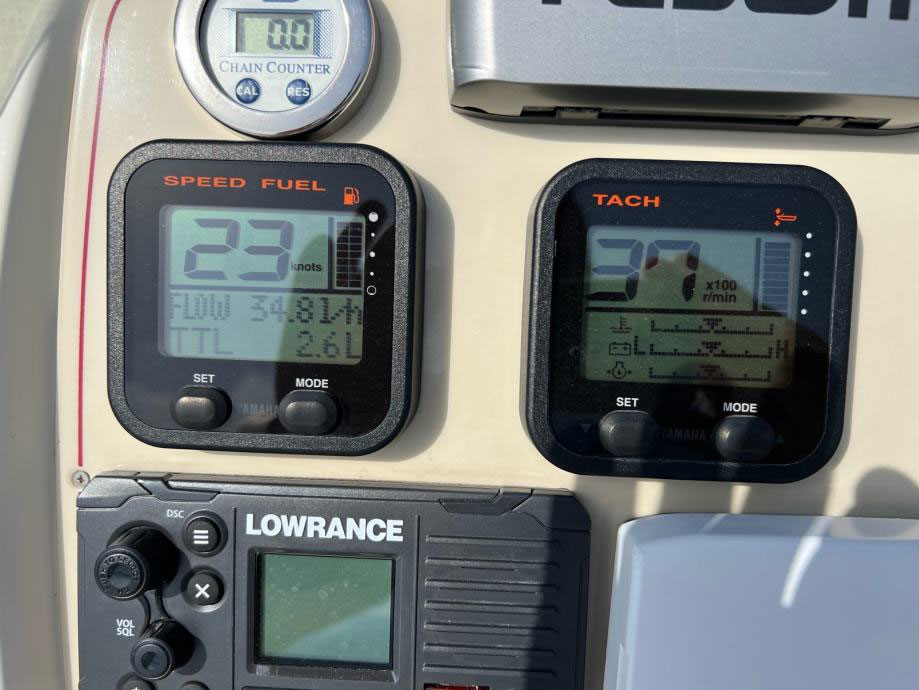 Equipment:GPS + depth sounder, Electric anchor winch, Bluetooth radio, VHF, 12 V charger, Deck shower, WC in console, Cockpit table, Bimini sunshade